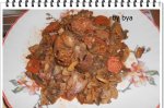 Clatim carnea cu apa ,o lasam putin sa se usuce,dupa care adaugam condimente(piper,vegeta,cimbru,boia dulce)si o punem in tigaie stropita cu ulei de masline si o acoperim cu apa sa se inmoaie. cand apa scade mai adaugam odata apa,dupa care se lasa sa se prajeasca,adaugam vin rosu . In ceaun...