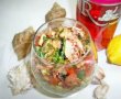 Adaugam sare si piper dupa gust. Intre timp,punem apa la fiert(500 ml la 100 g cus-cus),cand da in clocot,se adauga cus-cusul si il lasam la fiert 3-4 minute,dupa care stingem focul,acoperim cu un capac si il lasam sa se umflat,se strecoara,se limpezeste si se caleste in 50 g unt. Intr-un bol/vas/farfurie punem un rand de cus-cus,un rand de mazare,ultimul rand fructe de mare si presaram patrunjel proaspat tocat marunt. Serviti langa un pahar de vin,