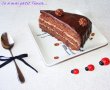 Pentru glazura: topim pe baie de aburi ciocolata amestecata cu frisca lichida si amestecam pana se topeste ciocolata. Lasam sa se raceasca usor apoi turnam peste tort, nivelam si lasam sa curga si pe margini.