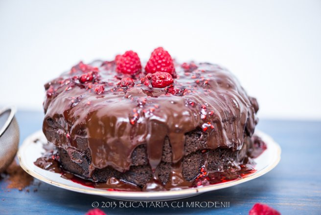 9. Dupa ce s-a racit blatul, se unge cu glazura de ciocolata si cea de zmeura. Se decoreaza cu cateva bucati de zmeura deasupra.